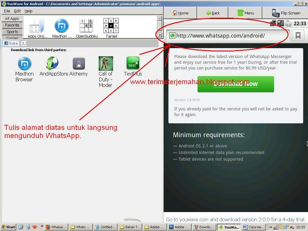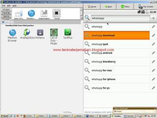 Disini saya akan menunjukkan cara sederhana cara untuk mengambil whatsapp langsung dari emulator youwave. Terdapat banyak cara lain, tapi saya pikir ini cara yang sederhana. Cara mengambil whatsapp yaitu: langsung saja ketik alamat untuk mengunduh whatsapp seperti gambar Gambar 10. Alamatnya: